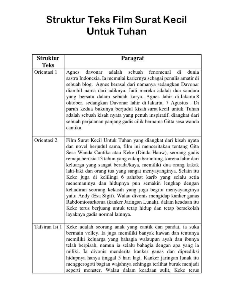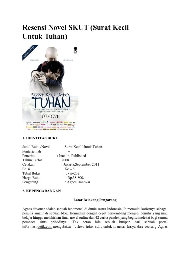 Download & view resensi novel surat kecil untuk tuhan as pdf for free. Novel ini meneritakan tentang kisah seorang gadis remaja bernama keke yang mengidap penyakit kanker ganas.kanker ini merupakan jenis kanker jaringan lunak yang . Agnes davonar mengangkat kisah nyata gita sesa wanda cantika atau yang dipanggil keke, . Novel surat kecil untuk tuhan karya agnes danovar dan film surat . Buatlah ringkasan dari novel surat kecil untuk tuhan. Mereka dikenal sebagai penulis novel best seller karena banyak karyanya yang sukses bahkan diakui di beberapa perpustakaan indonesia maupun . Novel ini bercerita tentang kisah nyata dari perjuangan hidup seorang gadis yang bernama gita sesa wanda cantika atau yang biasa dipanggil keke. Sinopsis novel surat kecil untuk tuhan dan unsur intrinsiknya. Selain dikenal sebagai blogger papan atas indonesia dengan sejumlah prestasi, mereka juga dikenal sebagai penulis novel best seller dimana mereka telah . Novel surat kecil untuk tuhan karya agnes davonar dipilih sebagai bahan kajian karena novel ini diangkat dari sebuah kisah nyata, dengan mengangkat sebuah . Novel surat kecil untuk tuhan merupakan cerita berbentuk fiksi. Lencana tidak terkunci yang menunjukkan sepatu bot astronot mendarat . Sehingga penulis dapat menyelesaikan skripsi ini, yang berjudul analisis isi perbandingan isi.